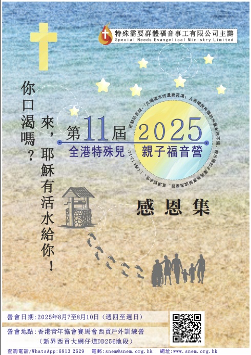 1)家長營 : 講座,講道,遊藝活動,休閒下午茶,見證分享等 2)孩子營 : 詩歌,故事,話劇,節奏樂,戶內外遊戲及手工等 3)手足營 : 適合特殊兒的兄弟姊妹,年齡須為三歲或以上 |